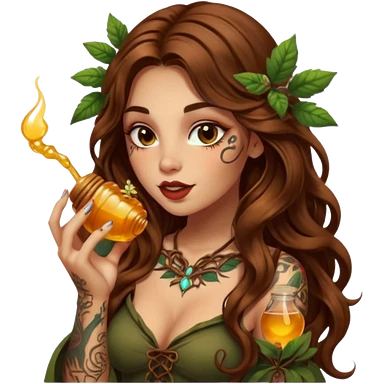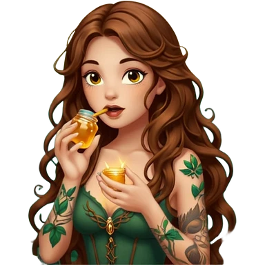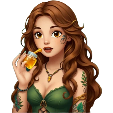 woman with long wavy brown hair, tattoos, forest mystic outfit, licking glowing honey from fingertip, flirty eyes emoji