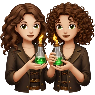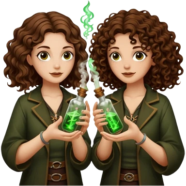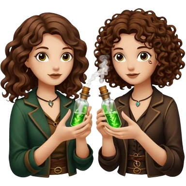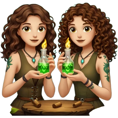two forest alchemist women one long wavy brown hair tattoos one short tight curly brown hair clinking glowing vials emoji