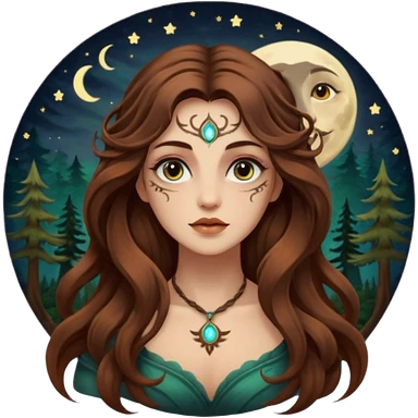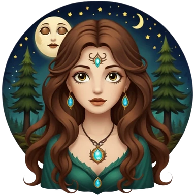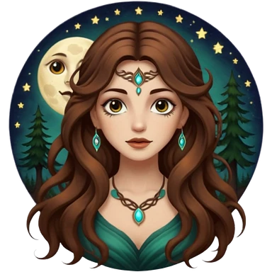 forest mystic woman long wavy brown hair tattoos half-lidded eyes moon glow emoji