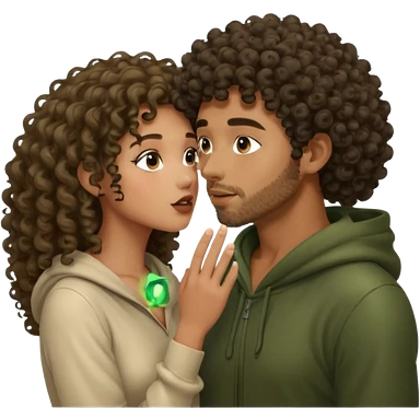 nude mixed-race woman with curls and nude hooded forest man, she whispering into his ear, glow dust emoji