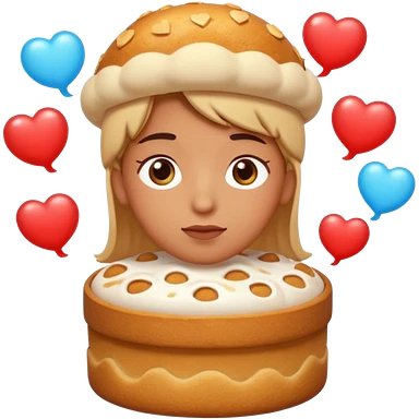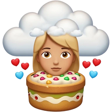 Apple-style emoji illustration of a person with dreamy eyes, and avobe them a thinking cloud with a traditionmal panettone inside, small hearts floating around, soft 3D emoji style, smooth gradients, rounded shapes, warm festive colors, simple expression. emoji