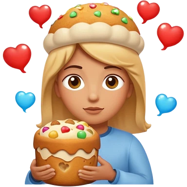 Apple-style emoji illustration of a cuteperson with dreamy eyes thinking of a traditional panettone, small hearts floating around, soft 3D emoji style, smooth gradients, rounded shapes, warm festive colors, simple expression, centered composition, transparent background, no text. emoji