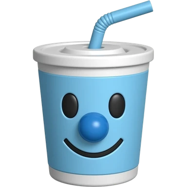 3D emoji kupa fincan, pasifik mavisi renk paleti, büyük yuvarlak mavi burun, fincanın içinde kısa düz pipet, 1930'ların çizgi film estetiği, parlak porselen dokusu, beyaz arka plan, yüksek çözünürlüklü render emoji