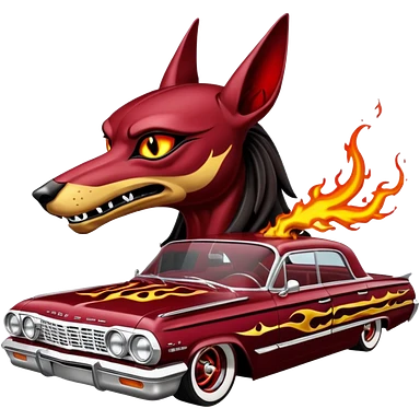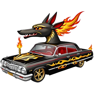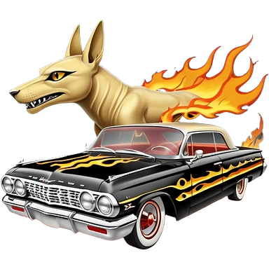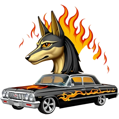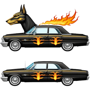 Satans Hot rod custom 1964 impala low rider four door Anubis theme painted hood flaming side-pipes driving straight to hell emoji