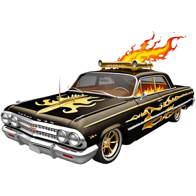 Satan’s streamlined Hot rod custom 1964 impala low rider four door themed painted hood flaming side-mounted under-door chrome exhaust pipes driving straight to hell emoji