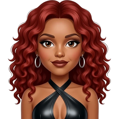 LaTavia Roberson from Destiny's Child with dark brown eyes, long red 1990s curly hair, black eyeshadow, dark brown lipstick, black metallic halter dress, earrings emoji