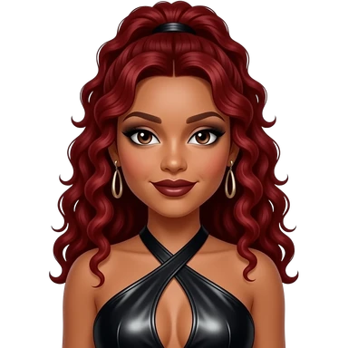 Beyonce from Destiny's Child with hazel eyes, long golden brown 1990s curly hair, black eyeshadow, dark red lipstick, black metallic halter dress, earrings emoji