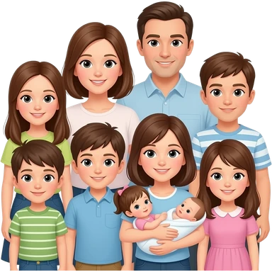 family of 8 white people and all with brown hair with 2 parents mom and dad with 6 kids 12 year old girl 10 year old boy 9 year old boy 8 year old girl smaller than the 9 yeaarold small 2 year old girl being held and newborn girl emoji