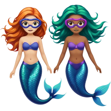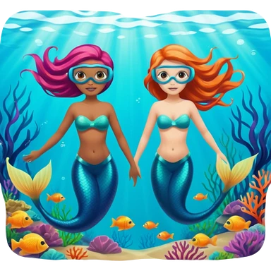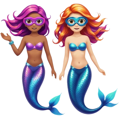 2 Mermaids one wearing a light pink snorkel mask and the other wearing black snorkel mask emoji | AI Emoji Generator
