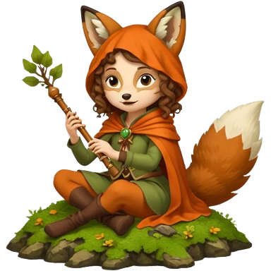 forest sticker character, woman with curly brown hair dressed as fox bard, tail cloak and ear hood, sitting on moss playing flute emoji