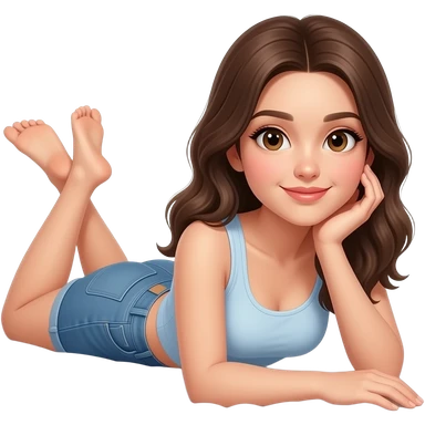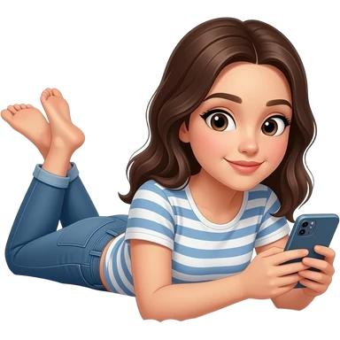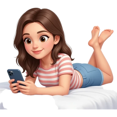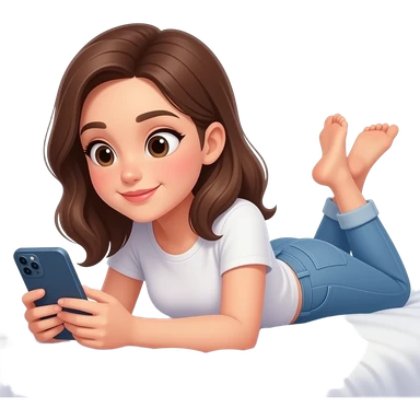 침대에 누워서 휴대폰을 보고 있는 캐주얼한 스타일의 예쁜 20대 여성 이모지 emoji | AI Emoji Generator