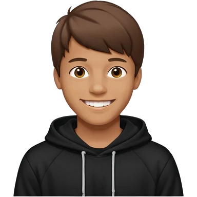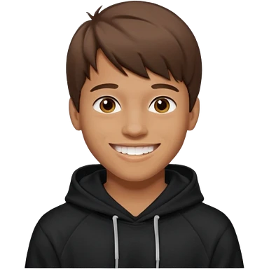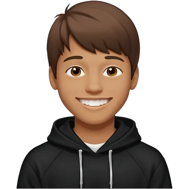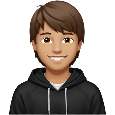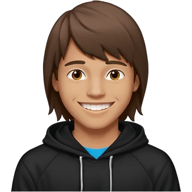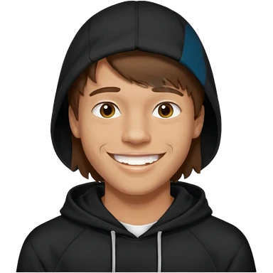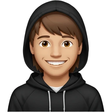 20 yr old man, brown hair, straight, big smile, white teeth, tanned skin, bangs, black hooded sweatshirt, long hair in back, center-parted bangs emoji | AI Emoji Generator