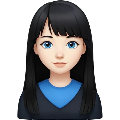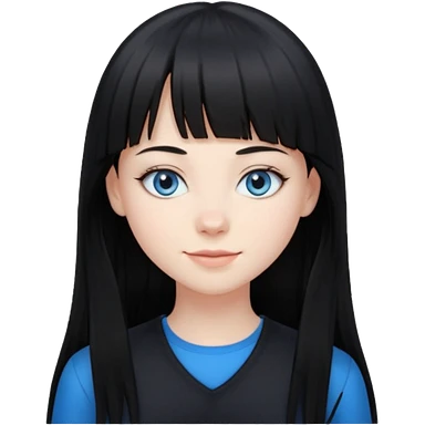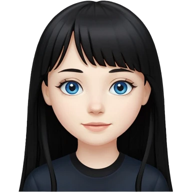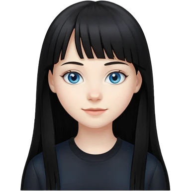 20 yr old woman long straight black hair, pale skin, blue eyes, black clothes, small smile, bangs emoji