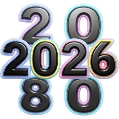 Word "2026" in a highly glossy black color, 3D style typography lettering, with each neon pastel color as a layered effect outlined around each letter, isolated, 3d rendering, no emoji icons no emoji faces and must have no human figures emoji