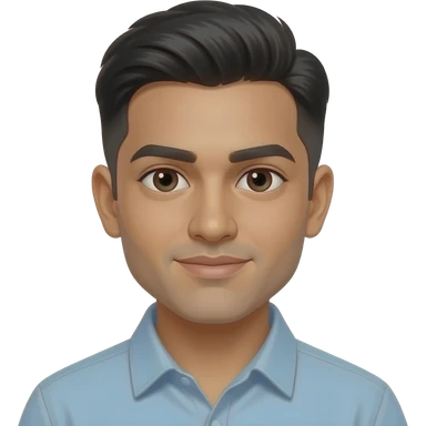 A 23 year old, South Asian man, with short black hair, with brown eyes wearing a t-shirt. emoji