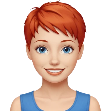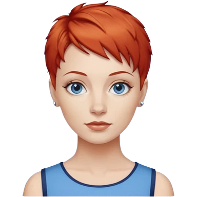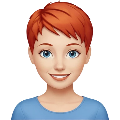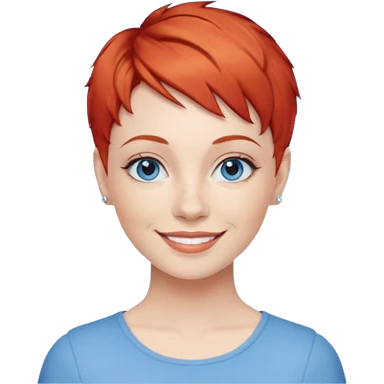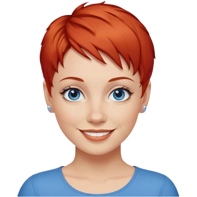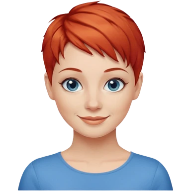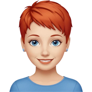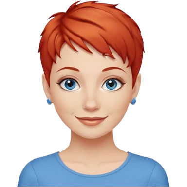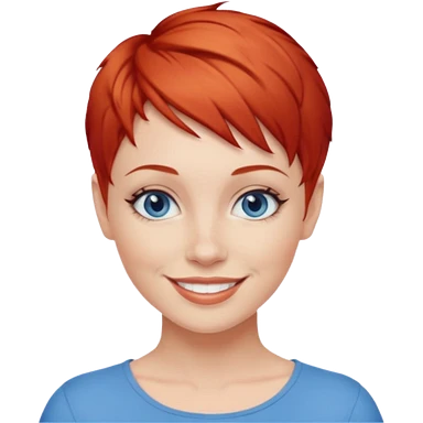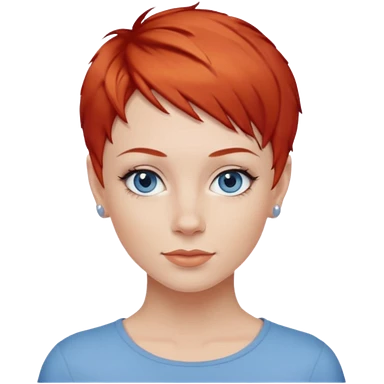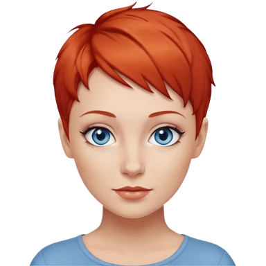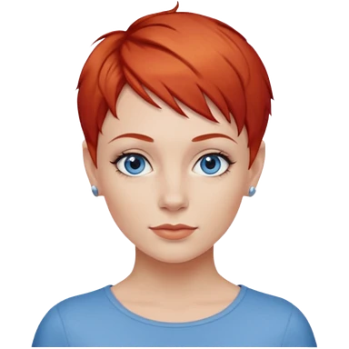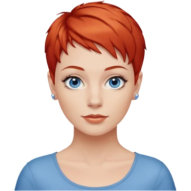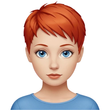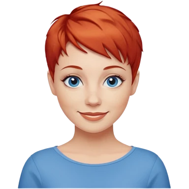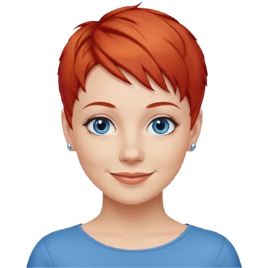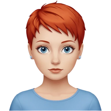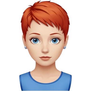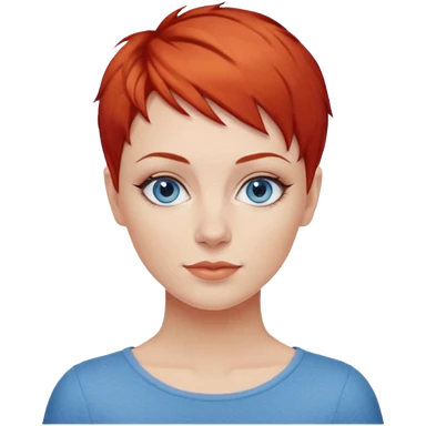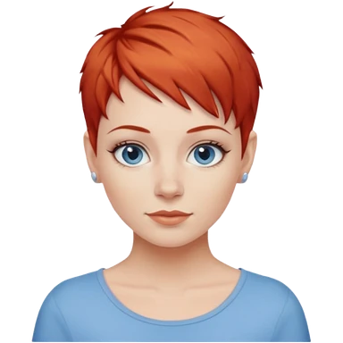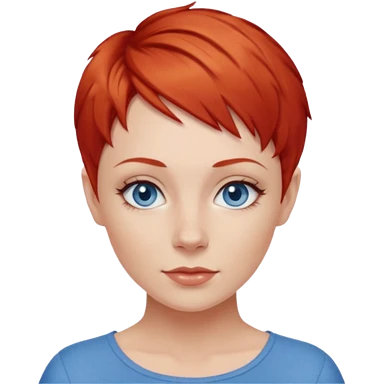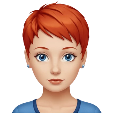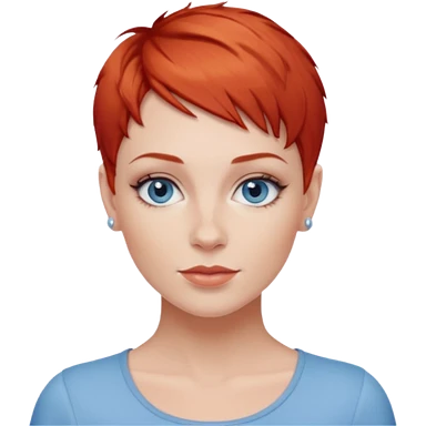 27 year old white woman, red hair, pixie cut, blue eyes emoji