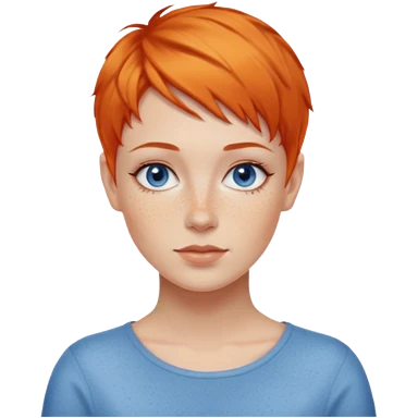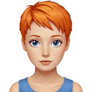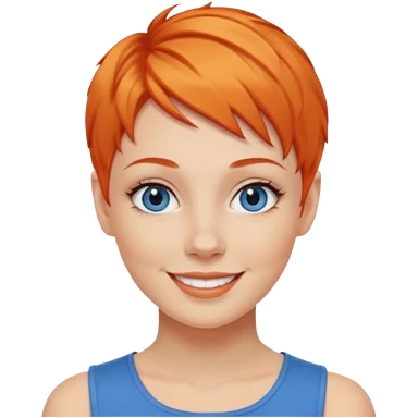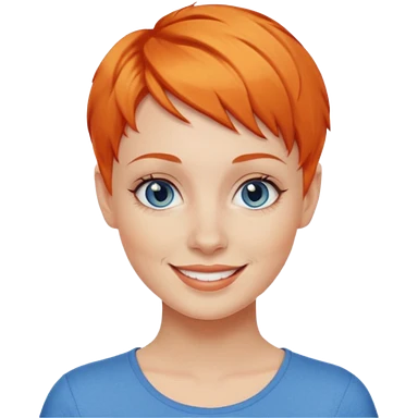27 year old white woman, orange hair, pixie cut, blue eyes emoji