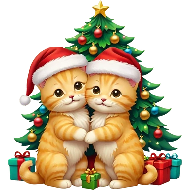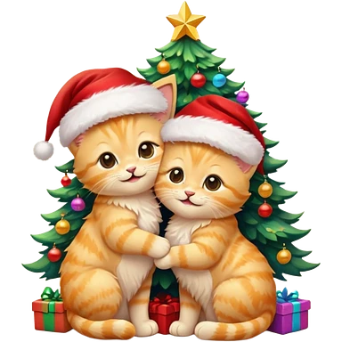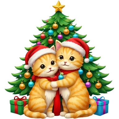 2 cute hugging smiling golden fluffy kittens with Santa hats by a colorful multicolored brightly lit up Christmas tree emoji