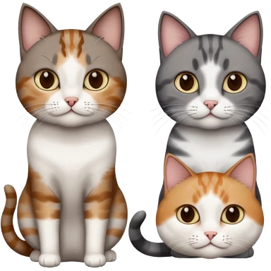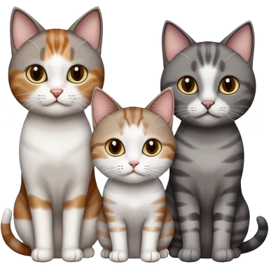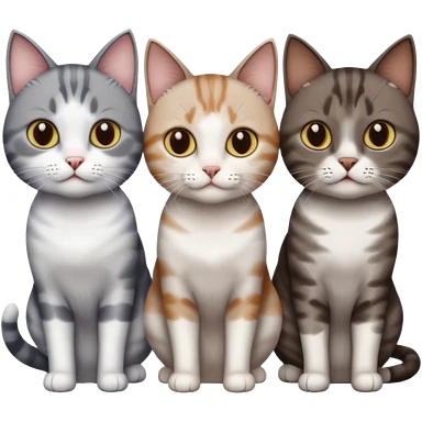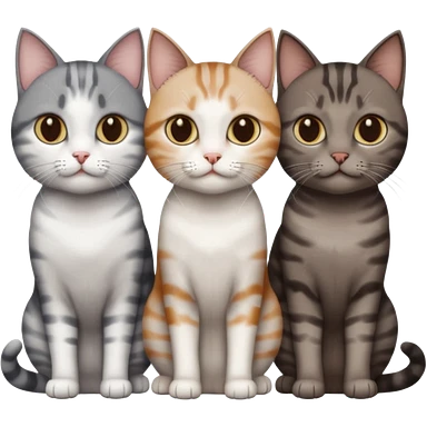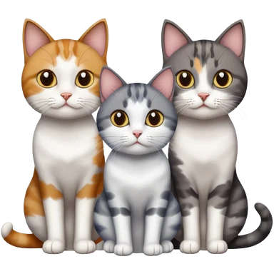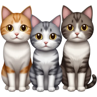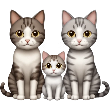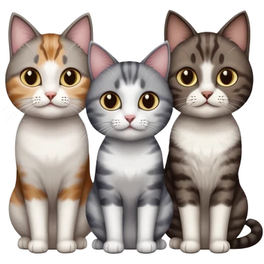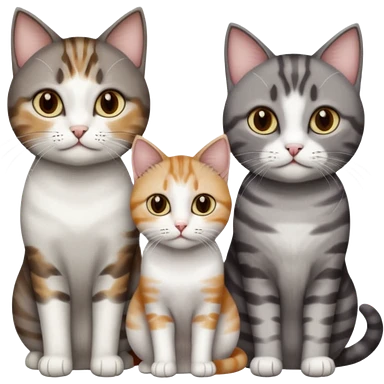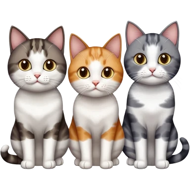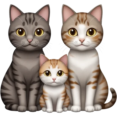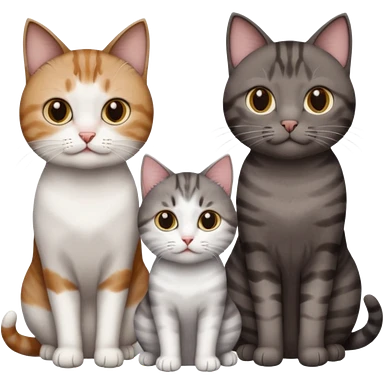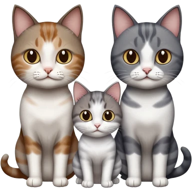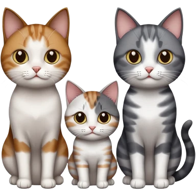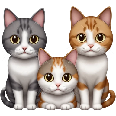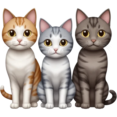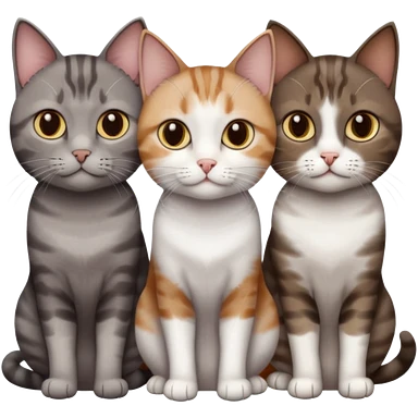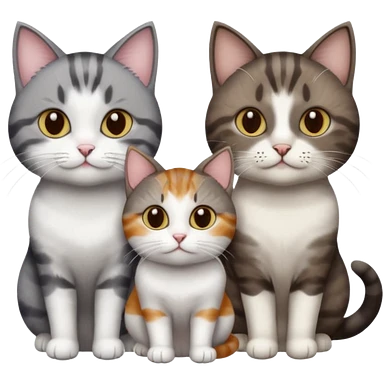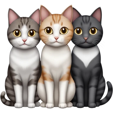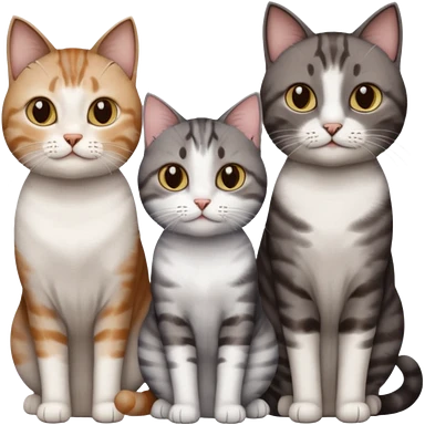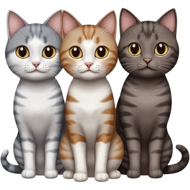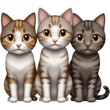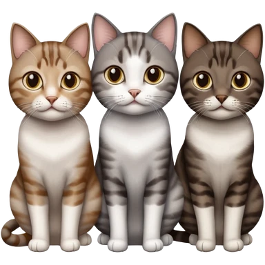 3 different coloured short haired cats including; a dark brown tabby and white cat, and a dark grey and white emoji