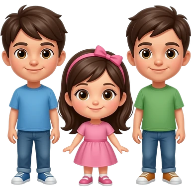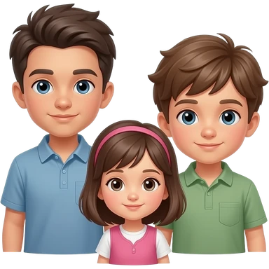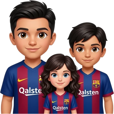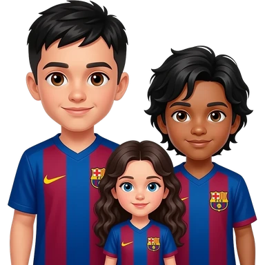 3 enfants, 1 garçon plus agé, 1 garçon moins agé que le premier et 1 fille la plus jeune, les garçons ont les yeux marrons, la fille les yeux bleus, les garçons uniquement ont un maillot du FC Barcelone emoji