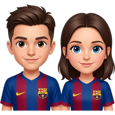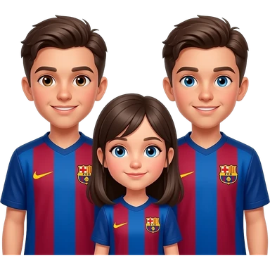 3 enfants, 1 garçon plus agé, 1 garçon moins agé que le premier et 1 fille la plus jeune, les garçons ont les yeux marrons, la fille les yeux bleus, les garçons ont un maillot du FC Barcelone emoji