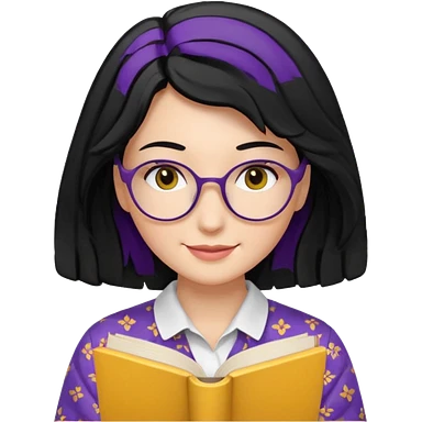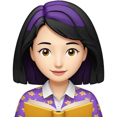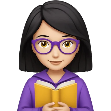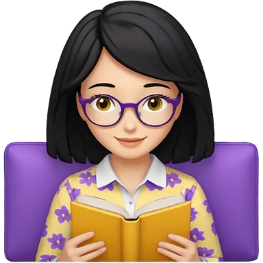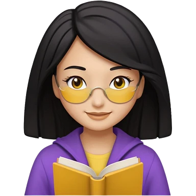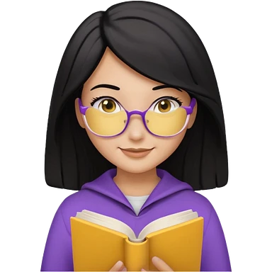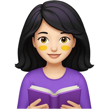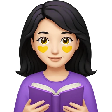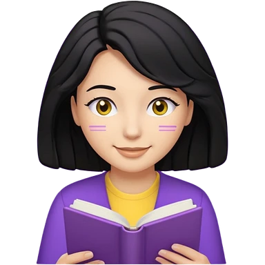 검정머리에 책읽고있는 여자. 해줘. 그리고 그 책으로 얼굴 반은 가린듯한 머리는 약간 파마 앞머리 없고 그리고 너무 무섭게 말고 책 읽는다고 얼굴 반은 가린듯한 책은 흰색에 보라색 노란색 섞여있고. 약간 미소 상의는 흰옷 . 아이폰 이모티콘 형태로 부탁 옷은 하얀색. 그리고 책은 흰색배경에 노란색 보라색 약간의 무늬 emoji