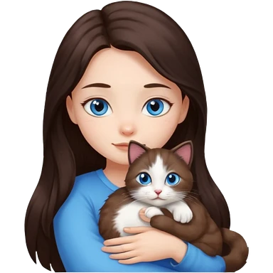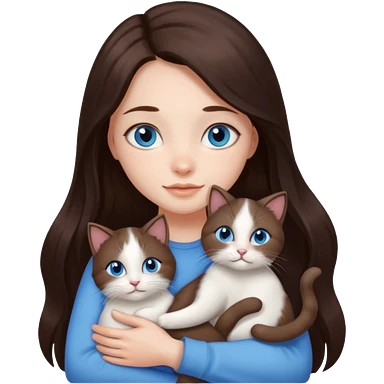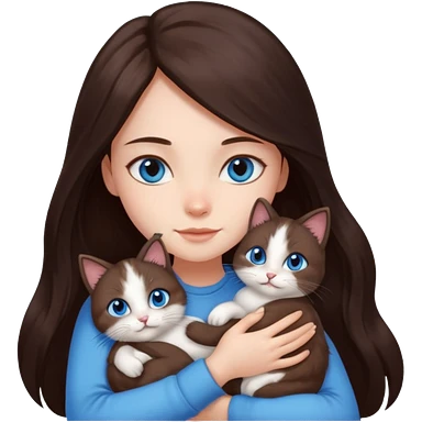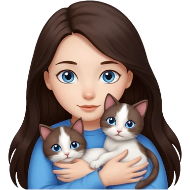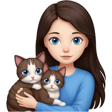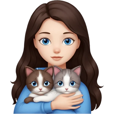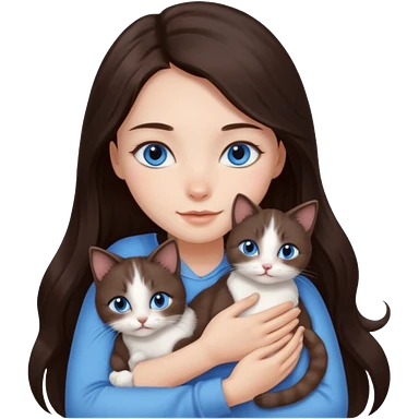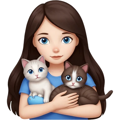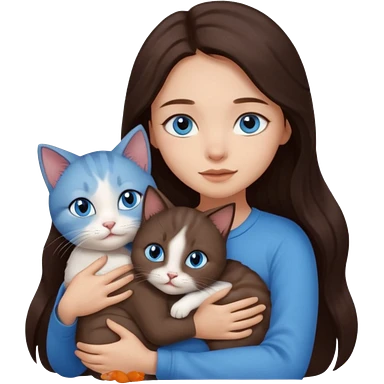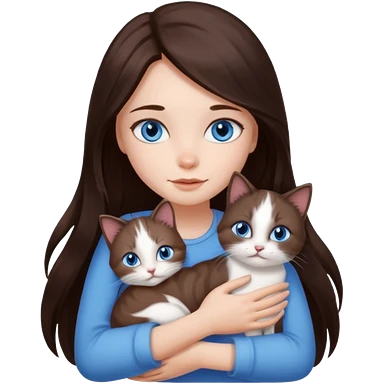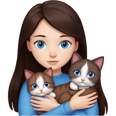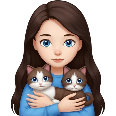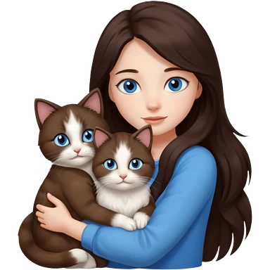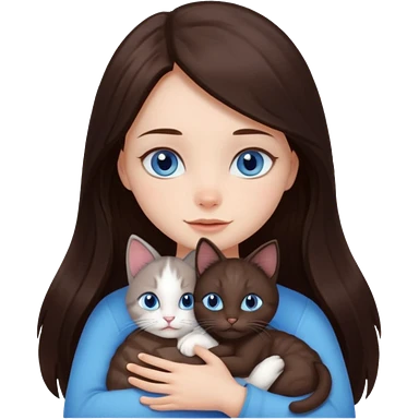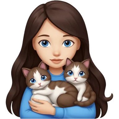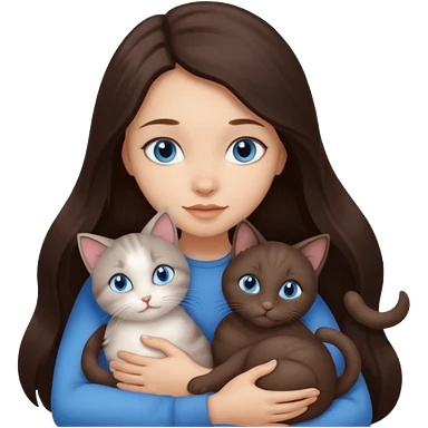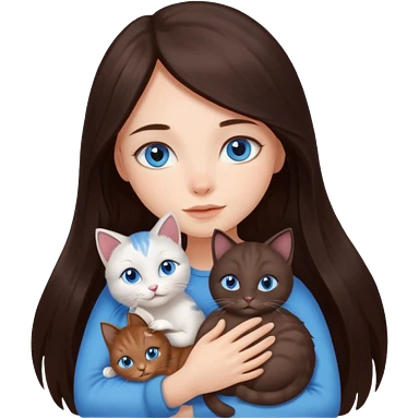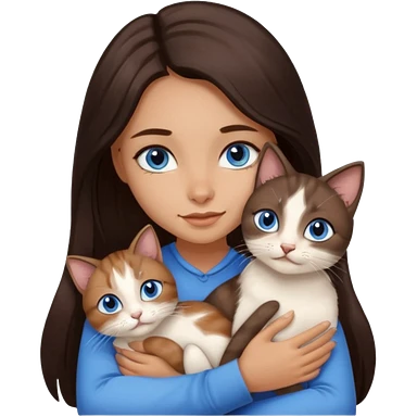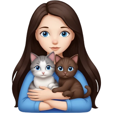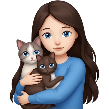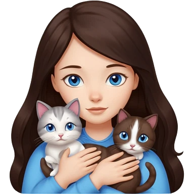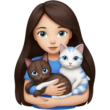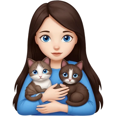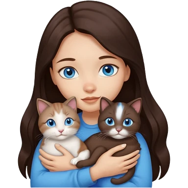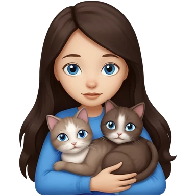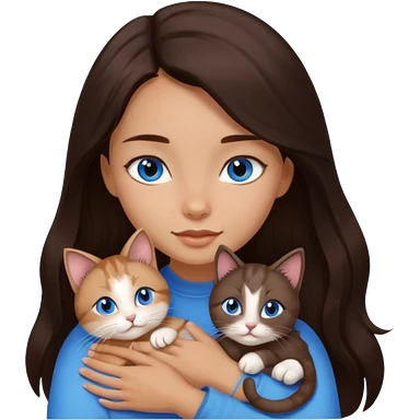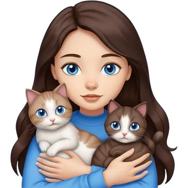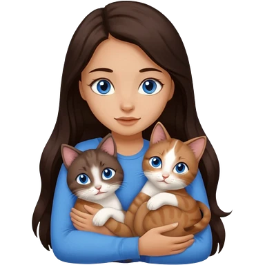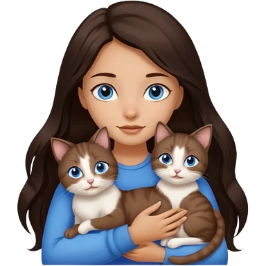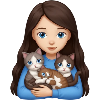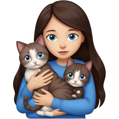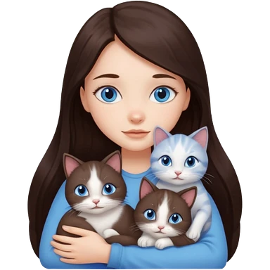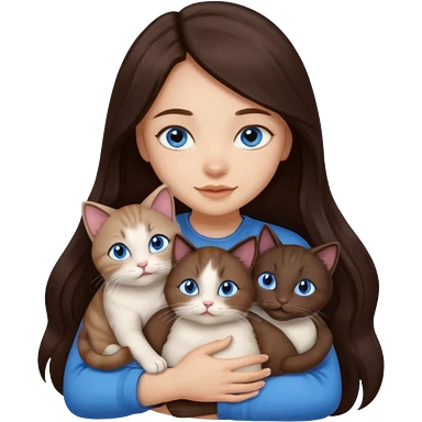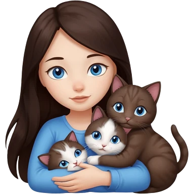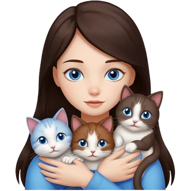 a pretty girl with long dark brown hair, with blue eyes, hugs 3 different natural coloured small cats emoji