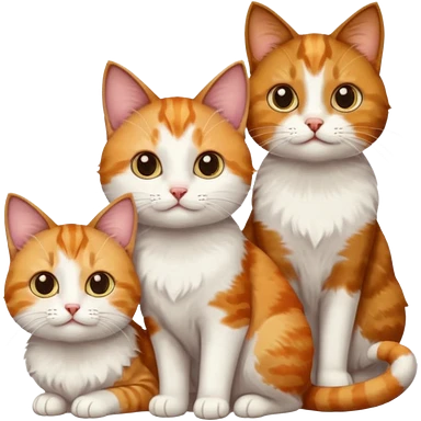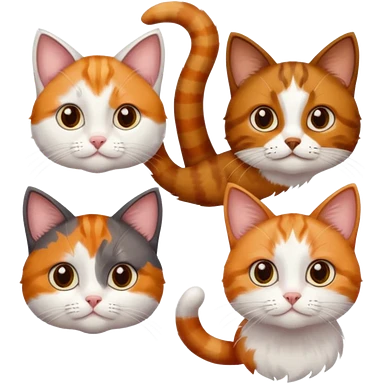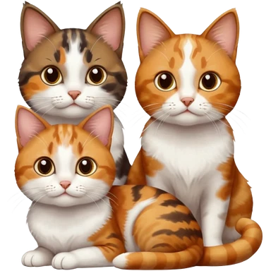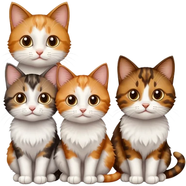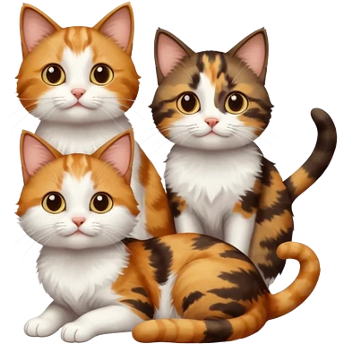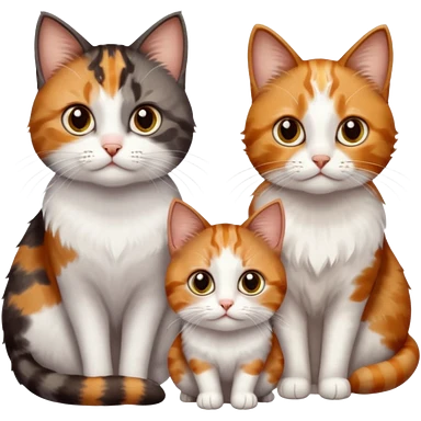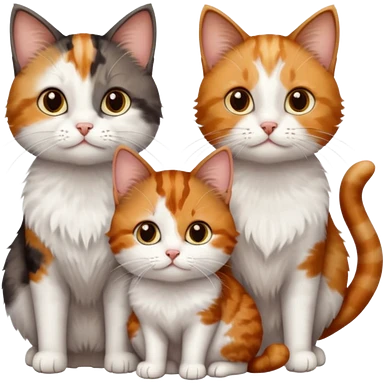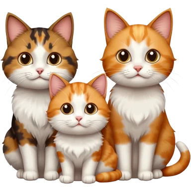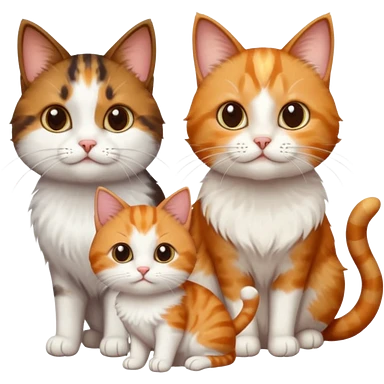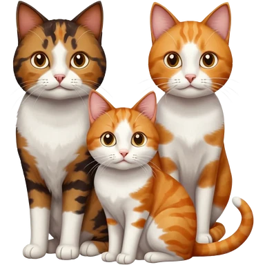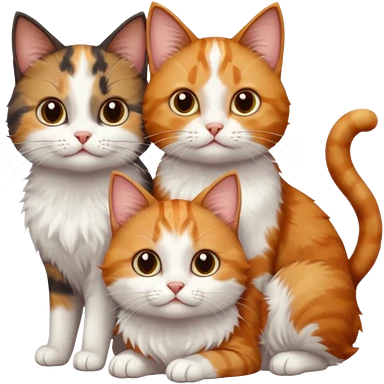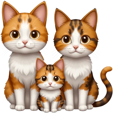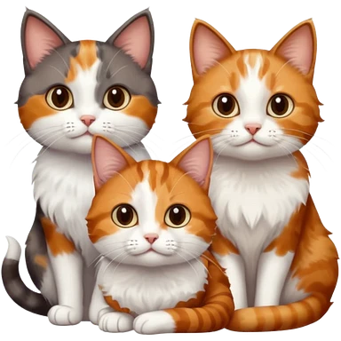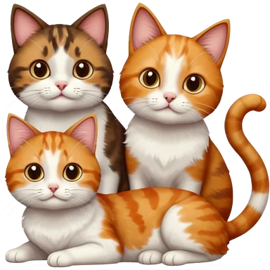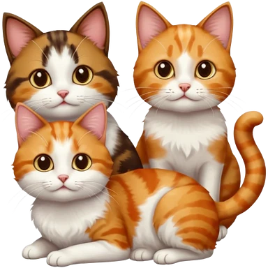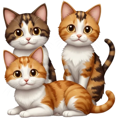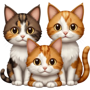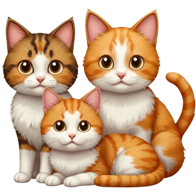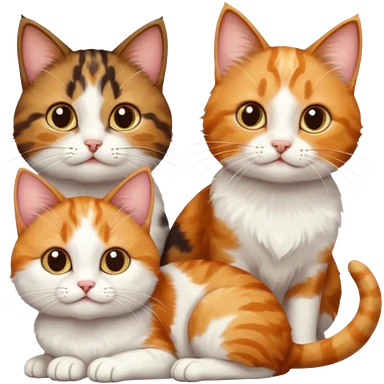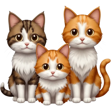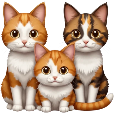 3 different coloured small cats including a dark brown tabby and white, and a patchy calico, and a ginger and white emoji