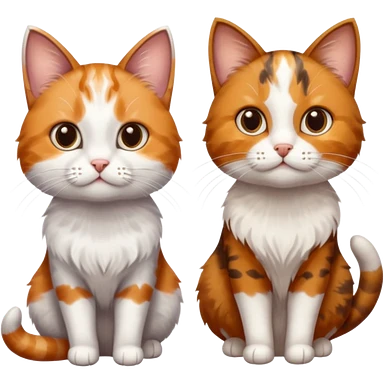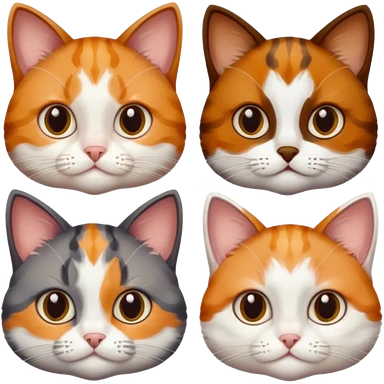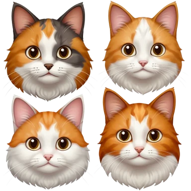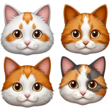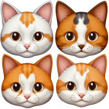3 different coloured small cats including a dark brown tabby and white, and a patchy calico, and a ginger and white emoji | AI Emoji Generator