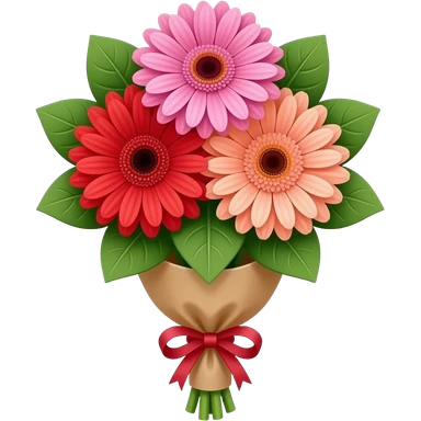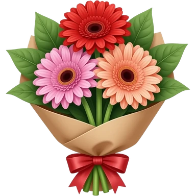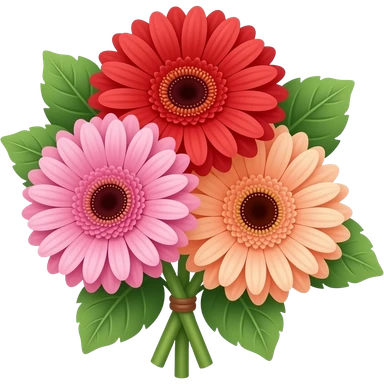 Bouquet with leaves and bouquet coverof three gerbera only with each colour having red, pink and peach in full screen with realistic gerbera emoji