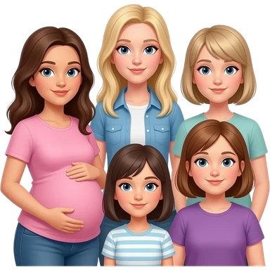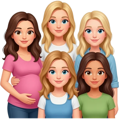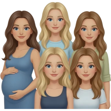 Standing together Caucasian women with long hair: 1 brunette whose pregnant, 1 dirty blonde tall, 1 mom 1 blonde with baby in arms, 1 blonde small, 1 brunette emoji