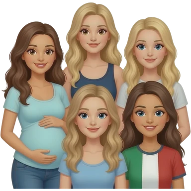 5 friends girls with long hair : 1 brunette who is pregnant, 1 dirty blonde tall thin, 1 blonde thin, 1 dirty blonde thin, 1 brunette Italian emoji
