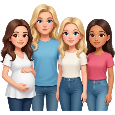 5 caucation girl friends long hair : a brunette who is pregnant, a dirty blonde tall thin, a blonde thin, a dirty blonde thin, a brunette Italian emoji