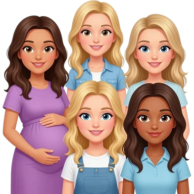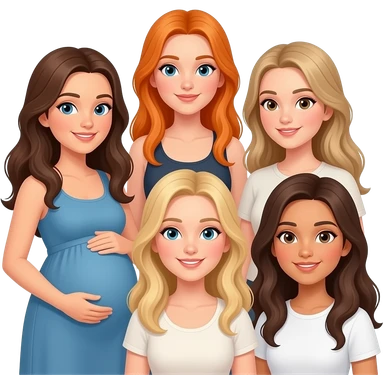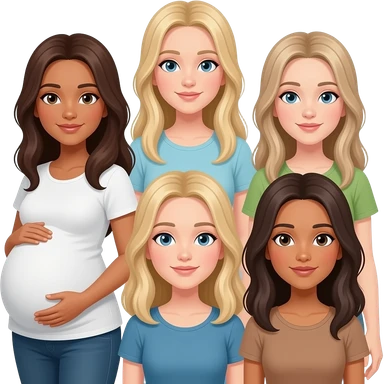 Create emoji of 5 friends: a brunette who is pregnant, a blonde tall thin, a blonde short thin, a dirty blonde short thin, a brunette short and a little chubby emoji