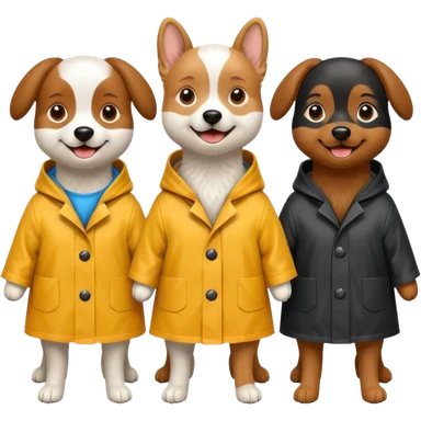 3 dogs wearing rain coats, one white maltese, 1 brown tri colour shihtzu and 1 black and white shitzu emoji