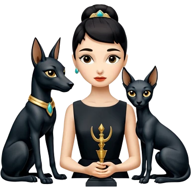 Kindly mannered Audrey Hepburn cleopatra Protecting spell silky black-haired tiny statuette scale feral Anubis and pyramid scenery stone-age cracked irregular dwelling emoji