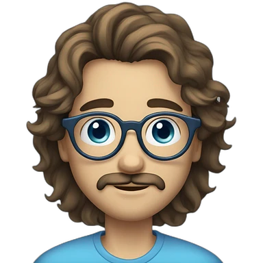 30 years old guy, with round glasses, blue eyes, long wavy hair, moustache circular glasses emoji