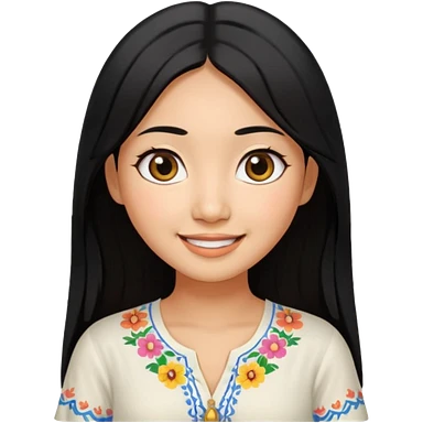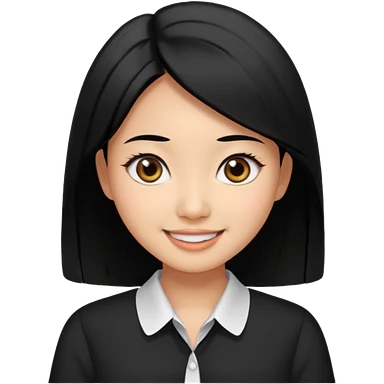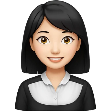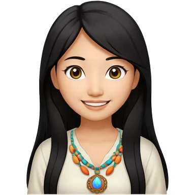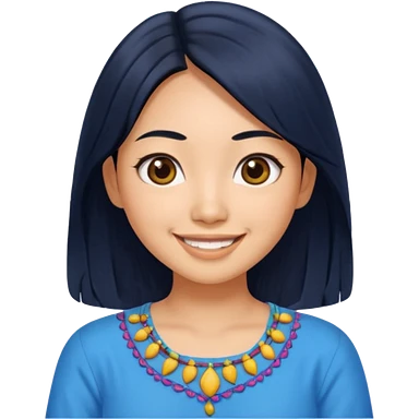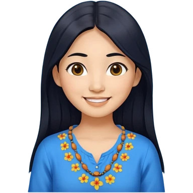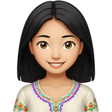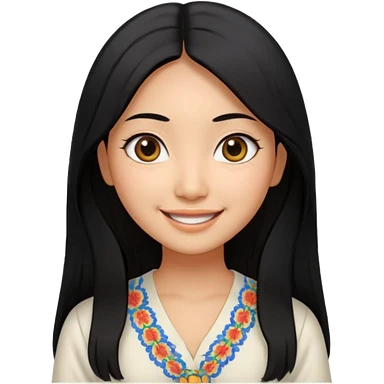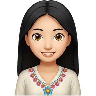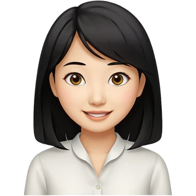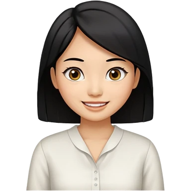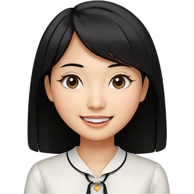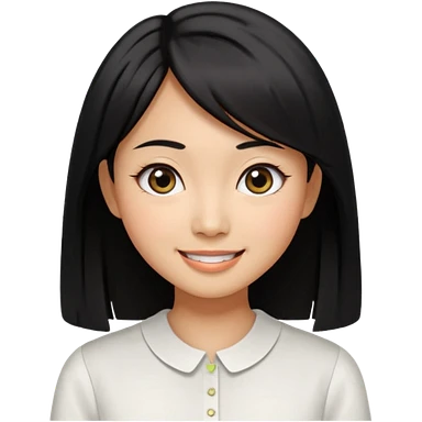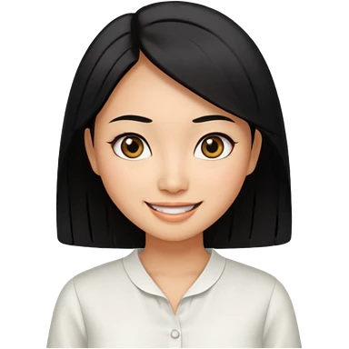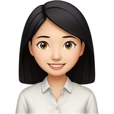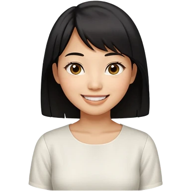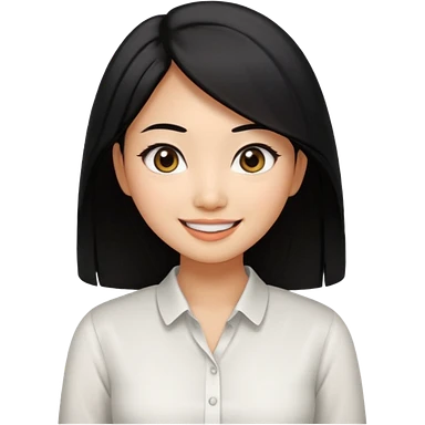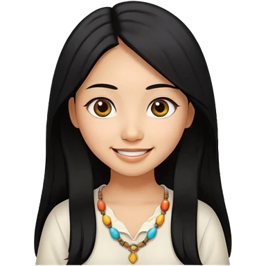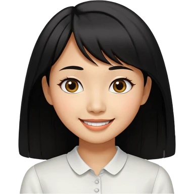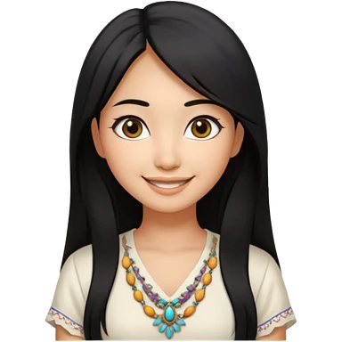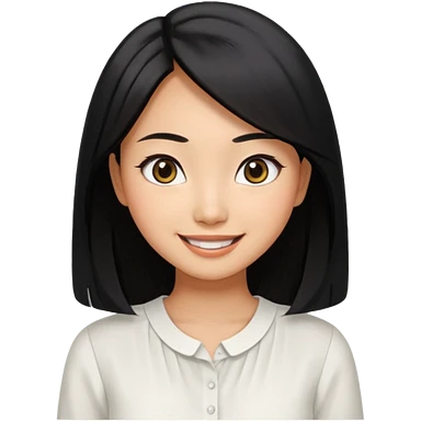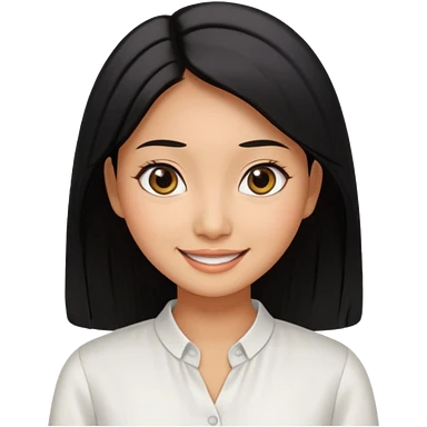 30 yr old asian woman center parted hair big eyes big smile tanned skin straight black hair hippie part hair white blouse shoulder length hair middle parted hair few short bangs at front trendy hair emoji | AI Emoji Generator