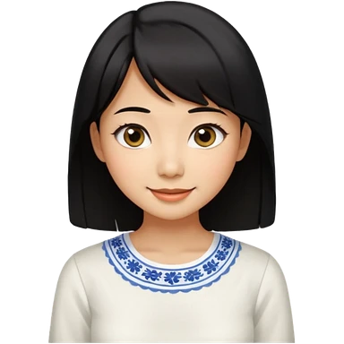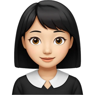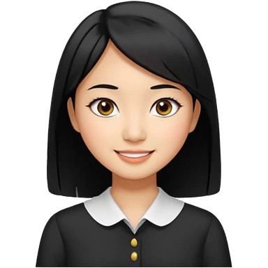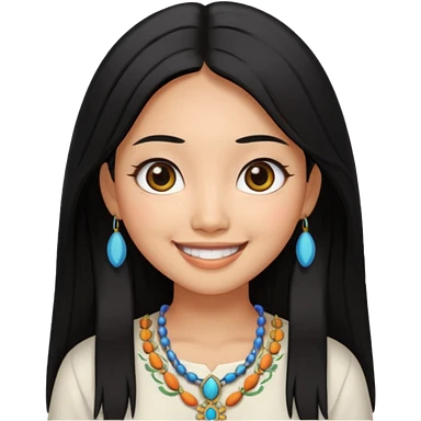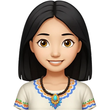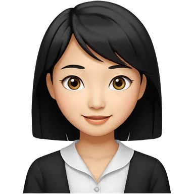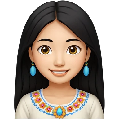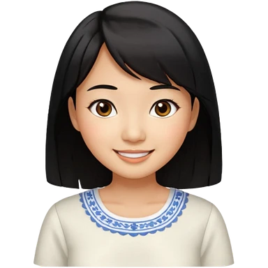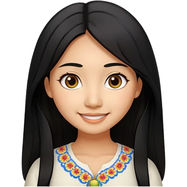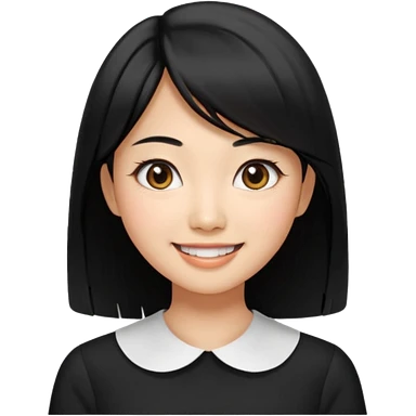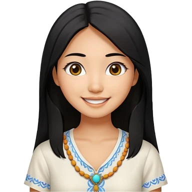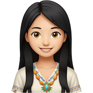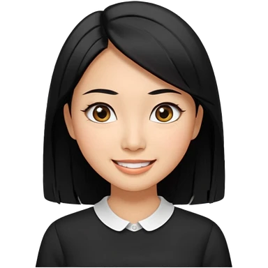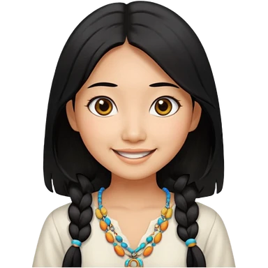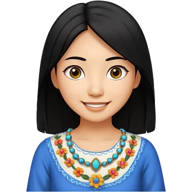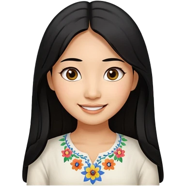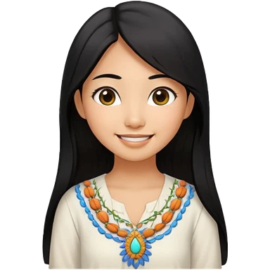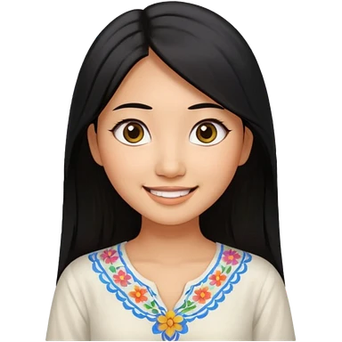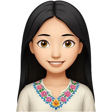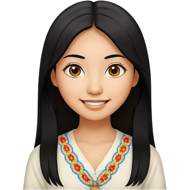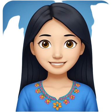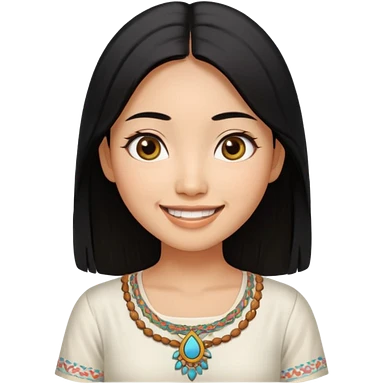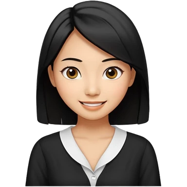 30 yr old asian woman center parted hair big eyes big smile tanned skin straight black hair hippie part hair white blouse shoulder length hair middle parted hair few short bangs at front trendy hair emoji | AI Emoji Generator