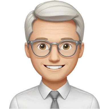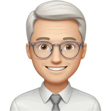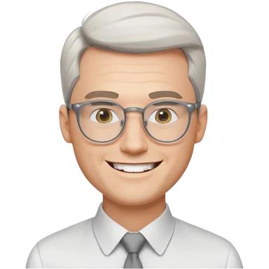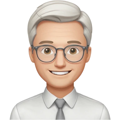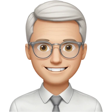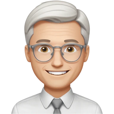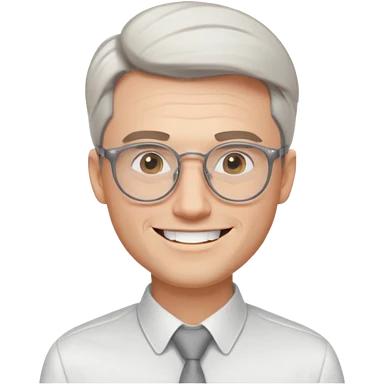30 yr old pale white man, white/grey side swept stylish hair, round glasses, big smile, white teeth, handsome, longer hair, thin glasses, white dress shirt, smooth forehead, botox, no tie emoji
