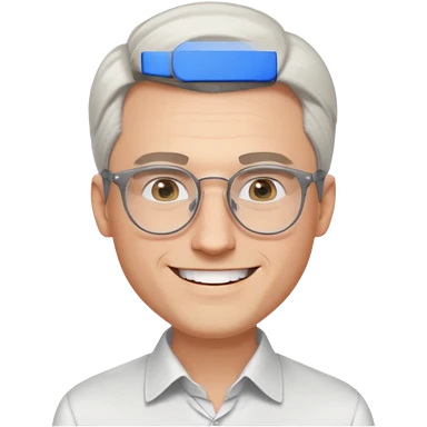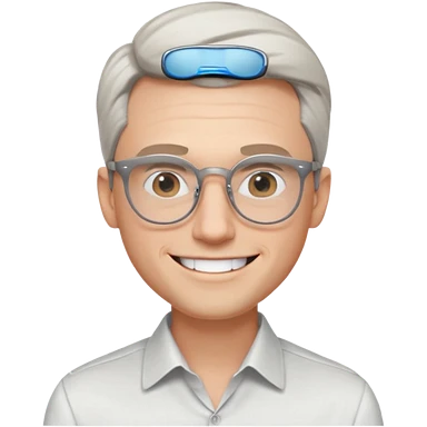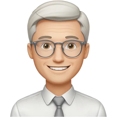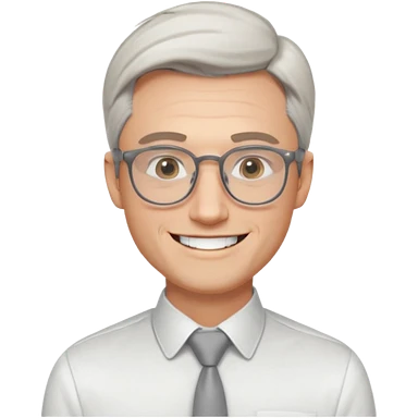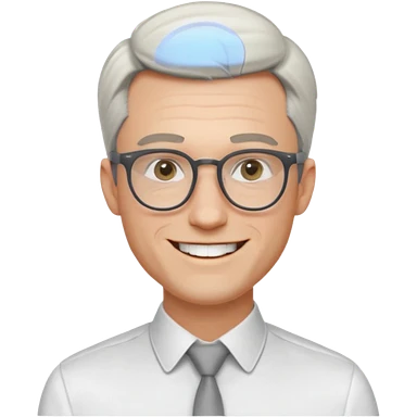 30 yr old pale white man, white/grey side swept stylish hair, round glasses, big smile, white teeth, handsome, longer hair, thin glasses, white dress shirt, smooth forehead, botox emoji