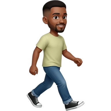 Apple-style 3D emoji of a young Black man with short fade haircut, light mustache and goatee, medium-brown skin. Walking pose like the Apple walking man emoji, one foot forward, natural arm swing. Slight confident smile. Clean glossy iOS emoji style emoji
