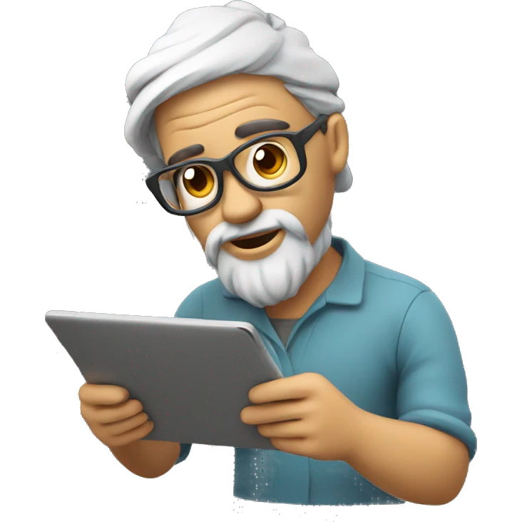 3d artist with beard sit on the PC with graphic tablet slight grey in beard. glasses are emoji