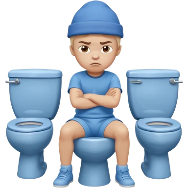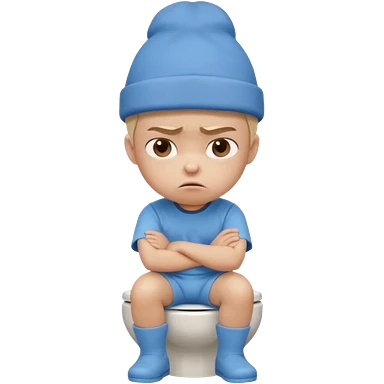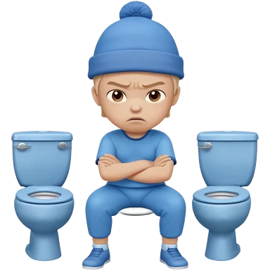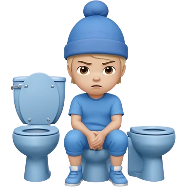 3D cartoon child character in blue outfit and blue hat, sitting on a toilet, looking angry with crossed arms, pastel background, preschool animation style." emoji | AI Emoji Generator