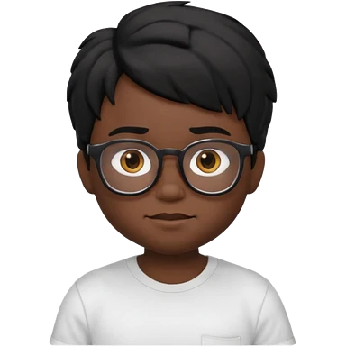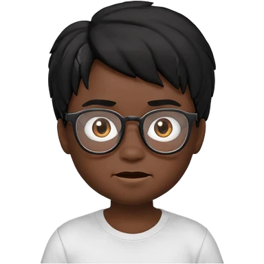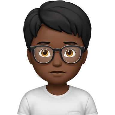 3D cartoon emoji portrait of a young character with black skin, messy black hair, big expressive brown eyes, wearing glasses and a white t-shirt, realistic shading, Pixar-style lighting, smooth texture, cute and slightly funny expression, high-quality render, white background, Apple Memoji styleemoji