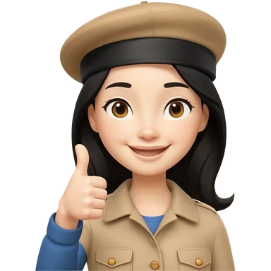 3D cartoon female character giving thumbs up, wearing beige beret, long black hair, smiling warmly with confident expression, clean white background, Pixar-style lighting, cute and friendly iPhone memoji aesthetic, high quality soft shading, centered composition emoji | AI Emoji Generator