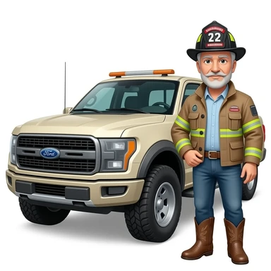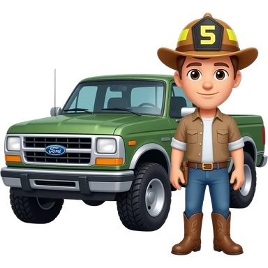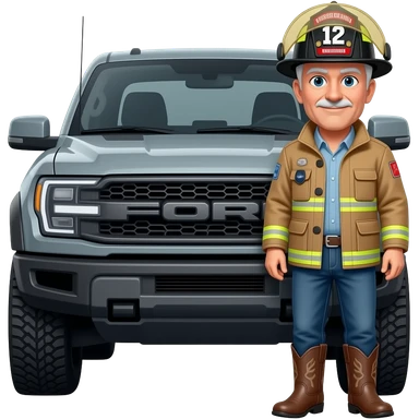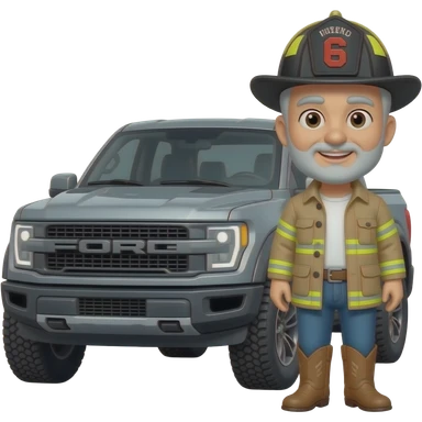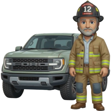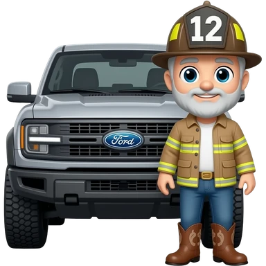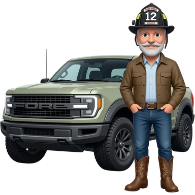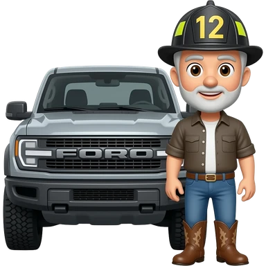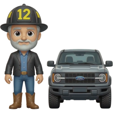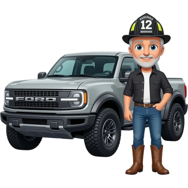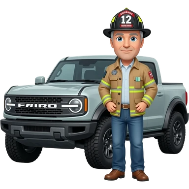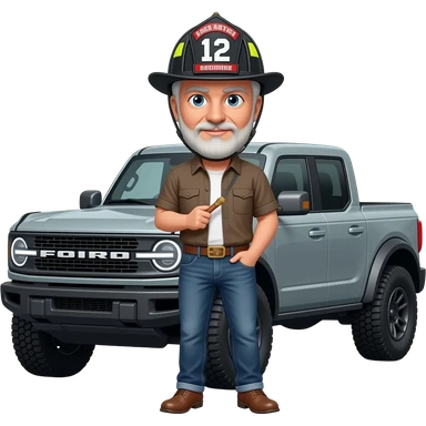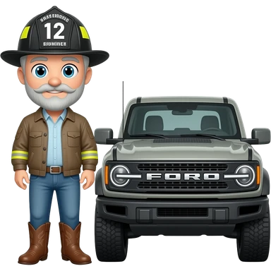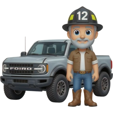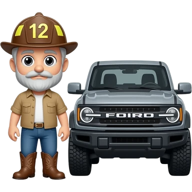 Ford bronco Cartoon emoji-style grey haired man in jeans, cowboy boots, and a firefighter helmet with 12 on the front standing next to marsh gray colored 2025 ford emoji