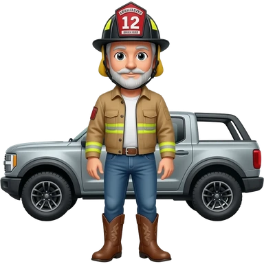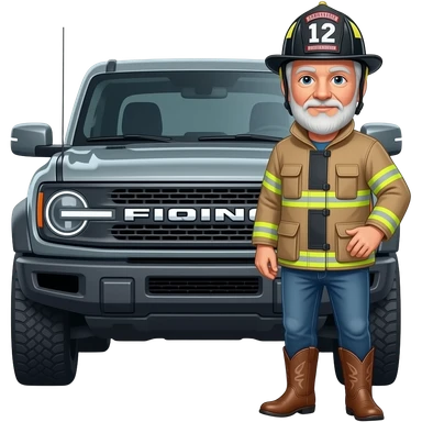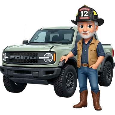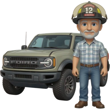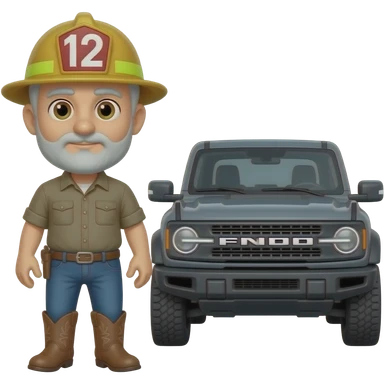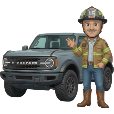 Cartoon emoji-style grey haired man in jeans, cowboy boots, and a firefighter helmet standing next to marsh gray colored 2025 ford bronco emoji