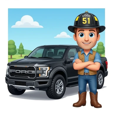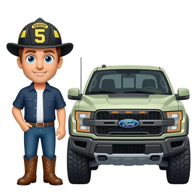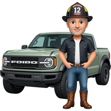 Cartoon emoji-style man in jeans, cowboy boots, and a firefighter helmet standing next to a black Ford Bronco in a garageMake the an to ford bronco marsh color in a garage emoji