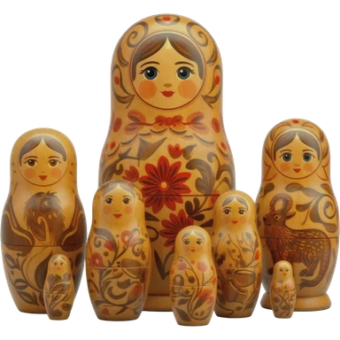 A modern Russian pop art matryoshka doll, fully opened and arranged horizontally in a clean, structured layout, with each layer revealing a unique, vibrant color while maintaining a cohesive palette. Smooth, glossy surfaces adorned with abstract, contemporary patterns create a sense of unity and depth. Rich, harmonious colors such as deep navy, coral, fuchsia, soft peach, and muted lavender contrast elegantly against a sleek gradient lavender-coral with noise background. The ultra-sharp focus, refined lighting, and high-end beauty product aesthetics bring a stunning, captivating glow to this 3D render. emoji